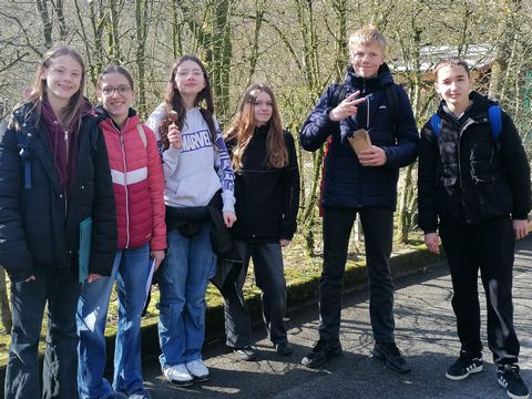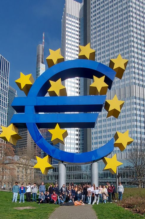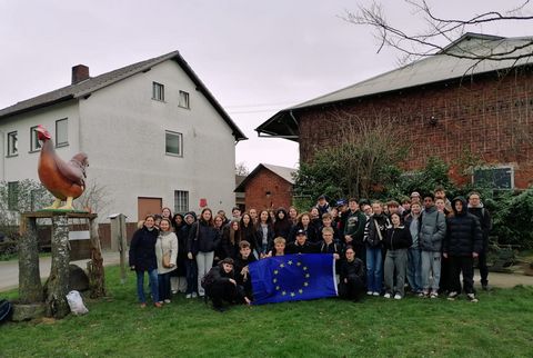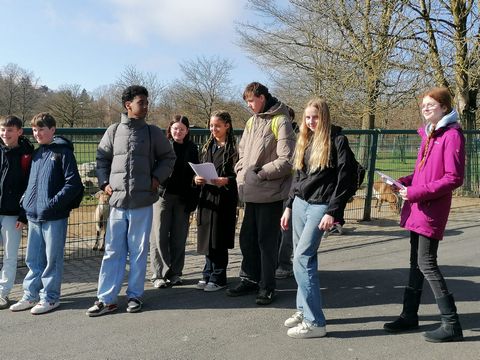 In der Woche vom 9. bis zum 13. März 2026 besuchten uns im Rahmen unseres Erasmus-Projekts 24 Schülerinnen und Schüler aus dem Collège Germinal in Biache. Themenschwerpunkt dieser Begegnung war die Tierwelt und so empfingen wir sie mit einer kleinen Theaterszene, in der ein französischer und ein deutscher Naturforscher durch den Regenwald spazierten und Tiere beobachteten. Nachdem unsere Gäste am Nachmittag ihre Gastfamilien kennenlernten, trafen wir uns zum Abendessen wieder in der Aula, wo gespielt und geplaudert wurde. Am Dienstag ging es dann nach Frankfurt/Main weiter, wo die deutsch-französische Austauschgruppe das Senckenberg Museum bei einer Führung durch die Highlights des Museums bzw. zum Klimaschutz besichtigte. Am Nachmittag konnten die Jugendlichen in Kleingruppen die Frankfurter Innenstadt erkunden, die Skyline oder den Römer bewundern und ein paar Souvenirs kaufen. Am Mittwochmorgen ging es nun darum, unsere Schule und den Unterricht zu besuchen, wobei unsere Biologiekollegin, Frau Weiser, das Konzept des Schulhundes der Austauschgruppe vorstellte. Den Nachmittag verbrachten die französischen Schüler mit ihrer Gastfamilie. Die Unternehmungen waren bunt gemischt: von Shopping über Naturwanderung, Bowling bis zum Schlossbesuch. Am Donnerstag stand dann der Opel-Zoo auf dem Programm mit Schülerrallye zur Biodiversität und Picknick im Freien. Elefanten, Leoparden, Giraffen, Affen und noch viele anderen Tiere konnten unter die Lupe genommen werden. Den Ausflug beendeten wir mit einem kleinen Stadtrundgang durch das nahegelegene Kronberg im Taunus. Am Abend feierten wir bei der gemeinsamen Party den „Karneval der Tiere“. Verkleidungen und Accessoires durften auch beim Tanzen nicht fehlen. Am Freitag wurde schließlich in Kleingruppen von französischen und deutschen Schülern die gesammelten Eindrücke der Tierwelt auf Plakate festgehalten und gemeinsam überlegt, wie wir in unserem Alltag das Leben der Tiere besser respektieren und schützen können. Ein Beispiel hierfür lieferte die anschließende Wanderung zum Obersteinberger Hof, wo Nutztiere, wie Kühe, Schweine oder Hühner, ihr gesamtes Leben verbringen. Auf der Anhöhe genossen die Schüler ihr Mittagessen, das aus Hofprodukten (Leberkäse, Äpfel) bestand, bei schöner Aussicht und konnten auch im Hofladen das heimische Lebensmittel für die eigene Familie mitnehmen. Insgesamt war es eine gelungene Woche, in der tierisch viel gelernt, gestaunt und gelacht wurde. Es entstanden neue Freundschaften und das nächste gemeinsame Projekt wird sehnsüchtig erwartet. Um unsere fünf Sinne soll es dieses Mal gehen. Aber mehr wird erstmal nicht verraten…